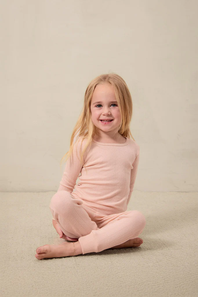 A keepsake-worthy take on our bestselling toddler pajamas, our Blush Pointelle Toddler Sleep Set is designed for more than just sleep. Buttery-soft, beautifully breathable, and made with the perfect amount of stretch, it’s the kind of set they’ll want to do everything in—play, lounge, snack, nap, and (eventually) head to bed. Finished with delicate pointelle knit and sweet lettuce-hem details, it strikes the balance between everyday comfort and heirloom charm, made to be worn on repeat and saved long after.