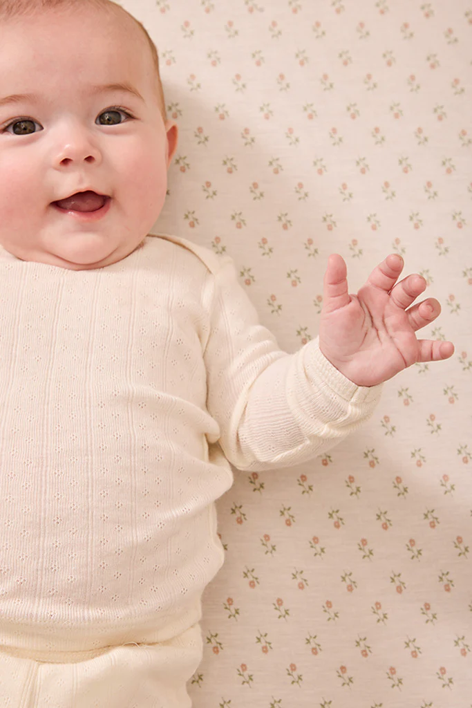 If you’re searching for the softest, most keepsake-worthy pajamas for your little one, look no further. Our Cream Pointelle Baby Sleep Set is crafted from a buttery-soft, breathable blend of TENCEL™ Modal and cotton, designed with comfort and care in mind. A tag-free top with a wide neckline makes dressing easy, while pull-on pants sit above the belly button to protect healing umbilical stumps. Footed bottoms and convertible hand covers help keep tiny hands and feet warm. Finished with delicate pointelle knit and sweet lettuce-hem details, this set is an ode to the little moments that make that first year so special.