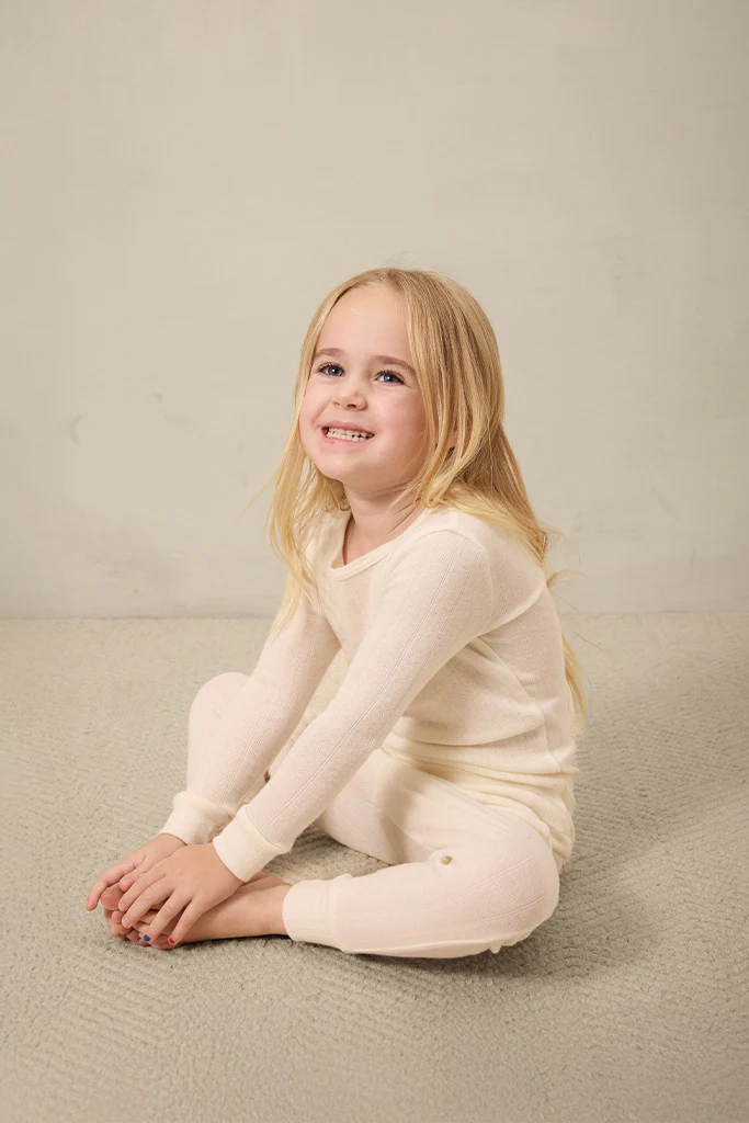 A keepsake-worthy take on our bestselling toddler pajamas, our Cream Pointelle Toddler Sleep Set is designed for more than just sleep. Buttery-soft, beautifully breathable, and made with the perfect amount of stretch, it’s the kind of set they’ll want to do everything in—play, lounge, snack, nap, and (eventually) head to bed. Finished with delicate pointelle knit and sweet lettuce-hem details, it strikes the balance between everyday comfort and heirloom charm, made to be worn on repeat and saved long after.